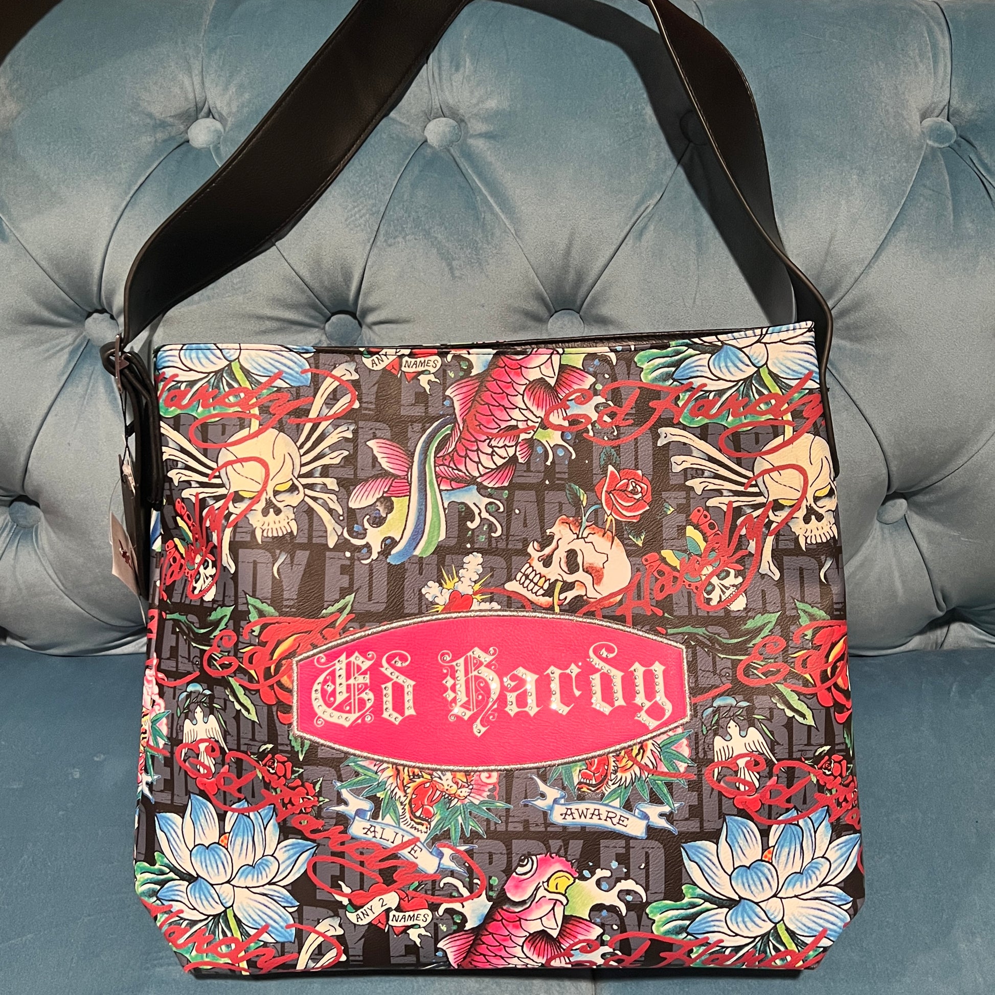 New Large Black ED HARDY Purse + Pouch NWT Tote Bag Tattoo Skull Heart Y2K
